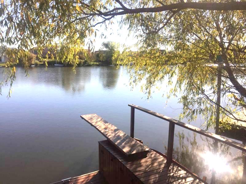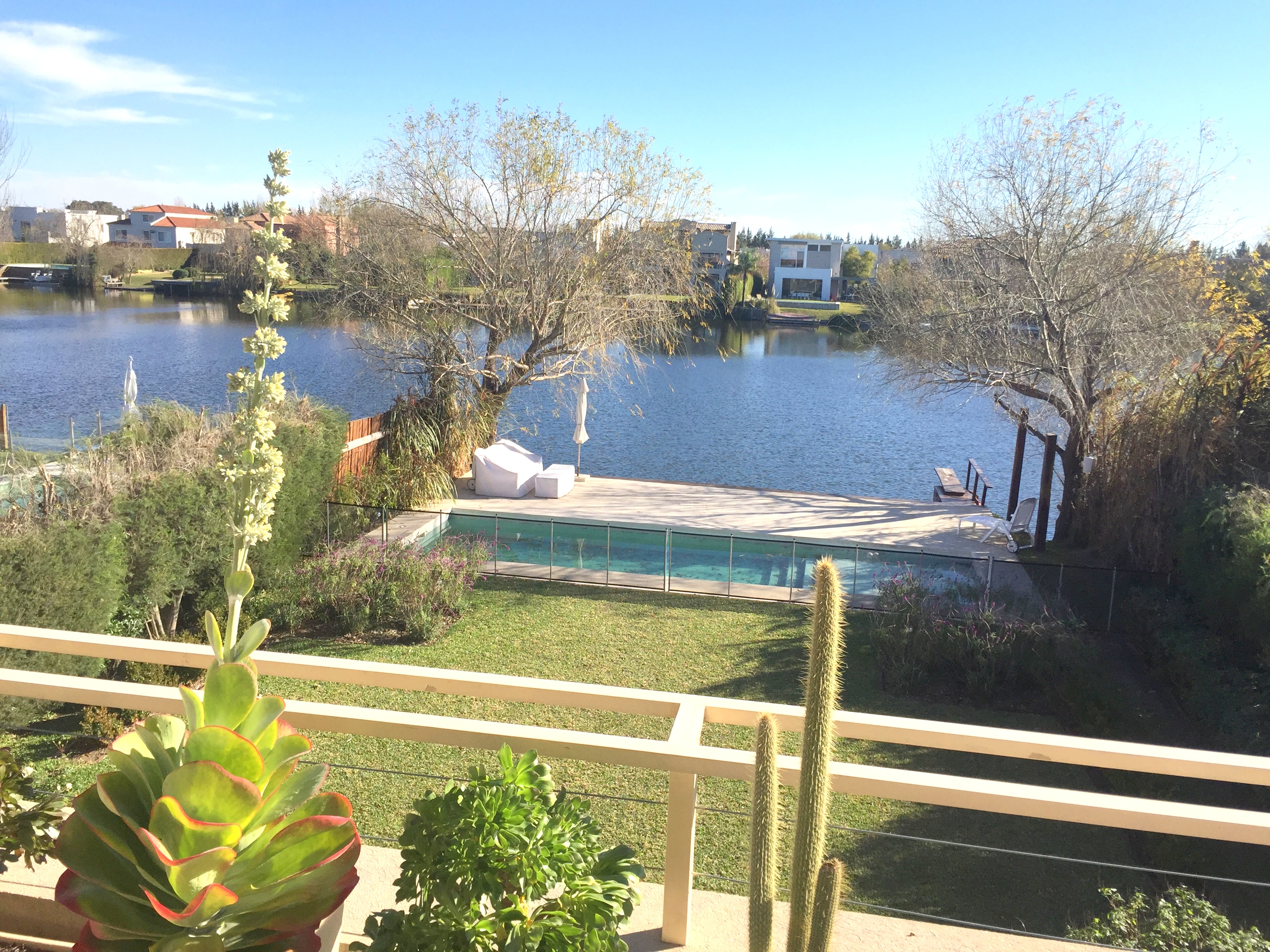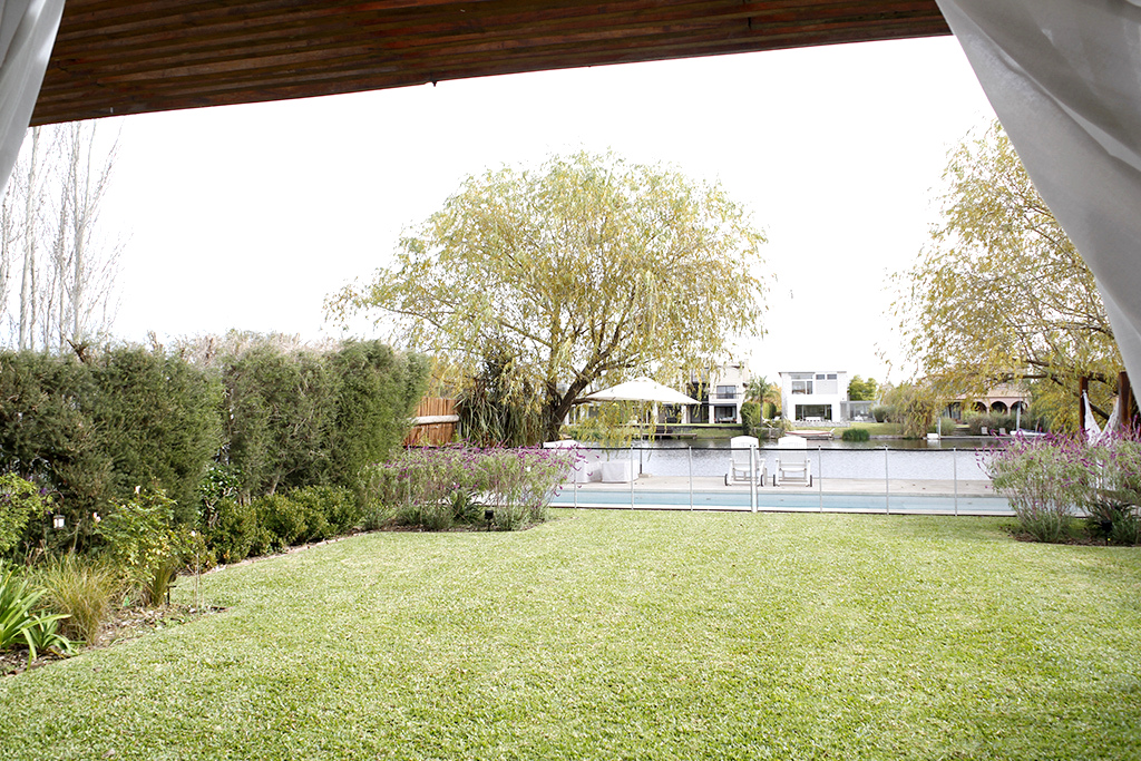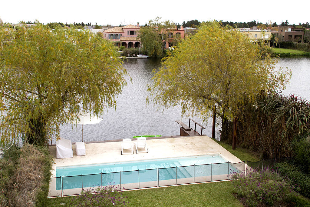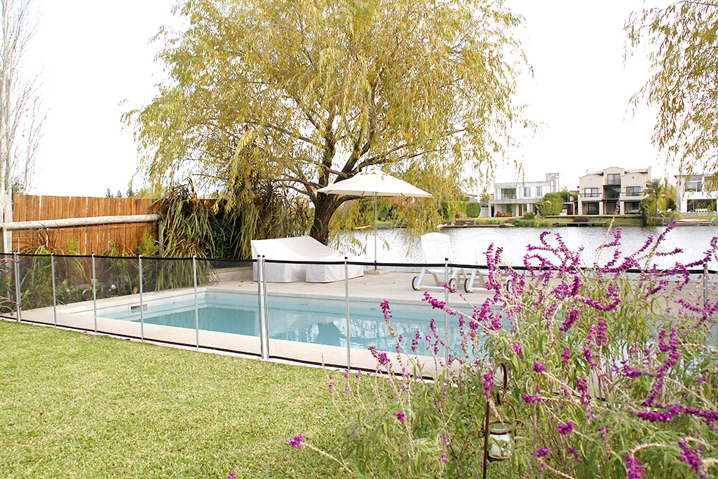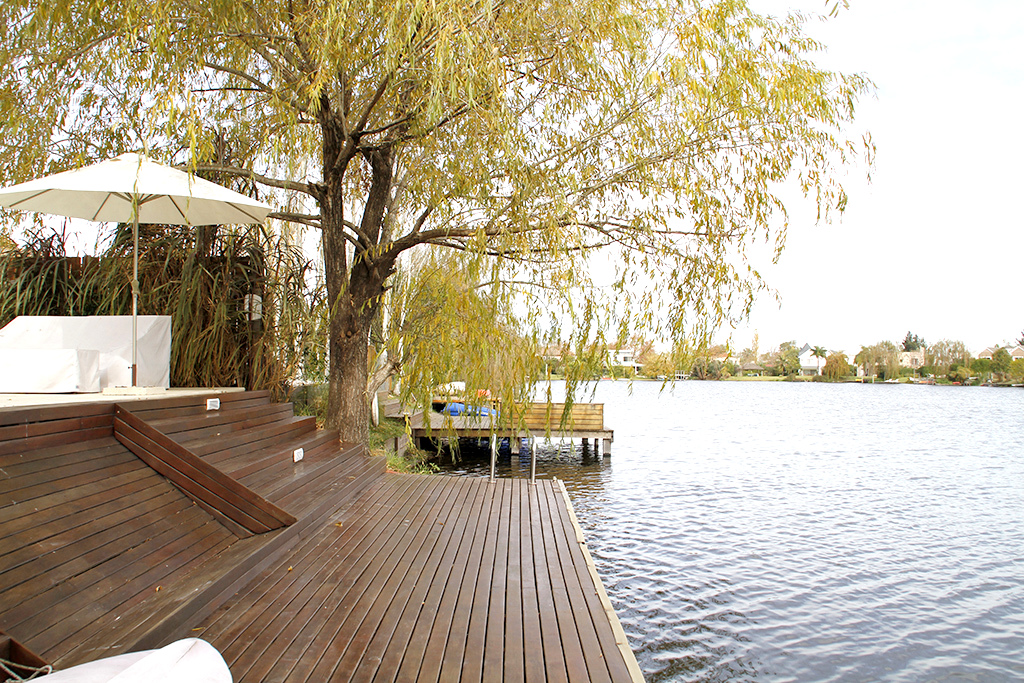 Piscina con solárium y desborde al infinito, luces y calefacción, y un muy amplio muelle con deck de lapacho, que abarca todo el ancho del terreno.