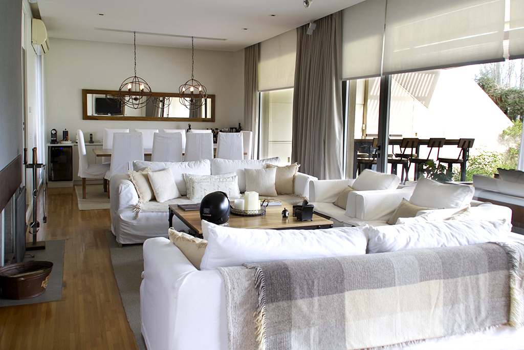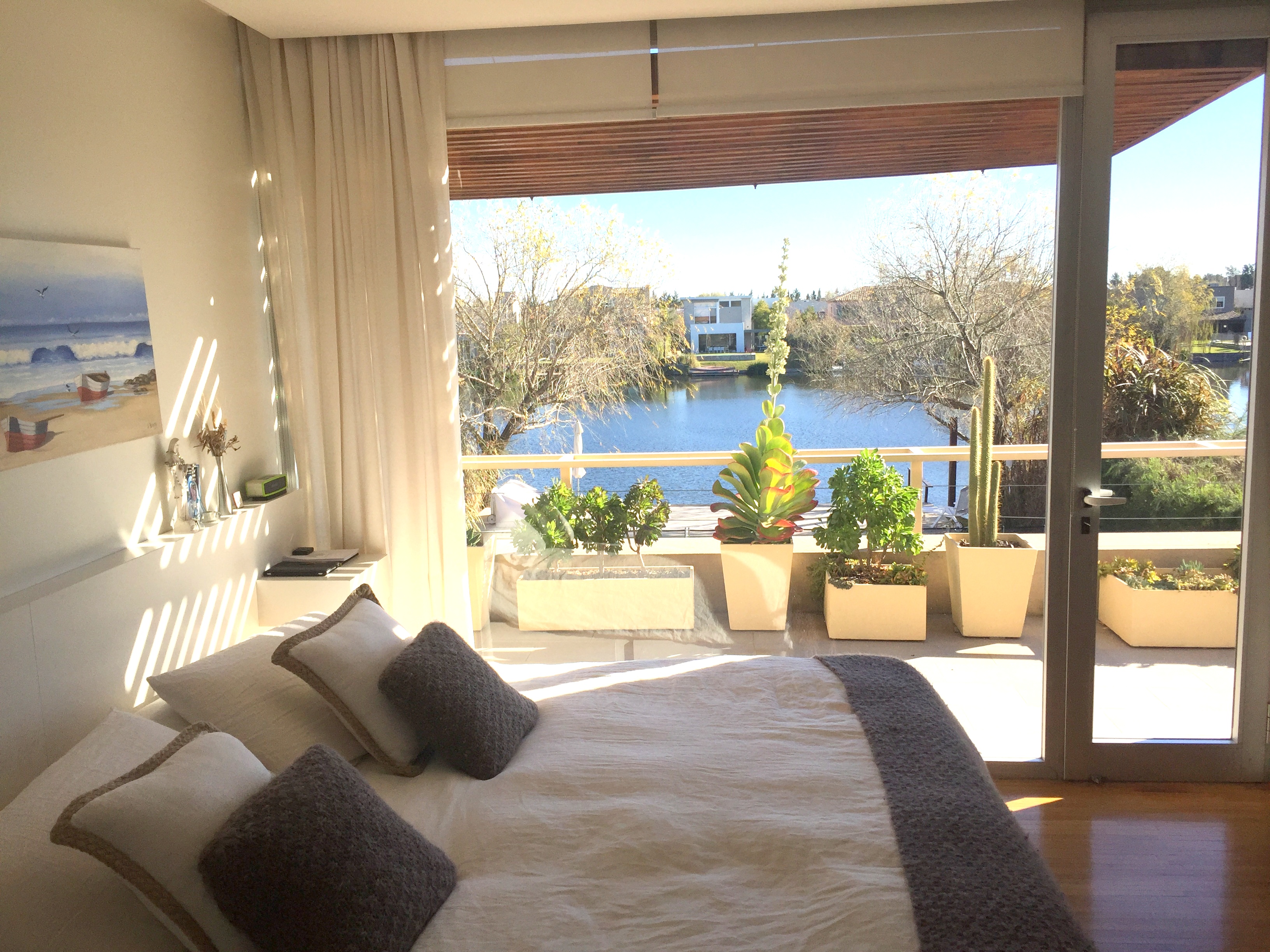 Planta Baja: Amplio hall de recepción, living-comedor apaisado con una muy linda vista al jardín y a la laguna, toilette de recepción, cocina semi integrada con una barra con el comedor diario totalmente equipada, y mucho lugar de guardado en bajo mesada y alacenas, bacha doble y espacio para heladera grande, dependencia de servicio y lavadero independiente.