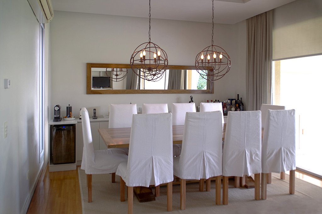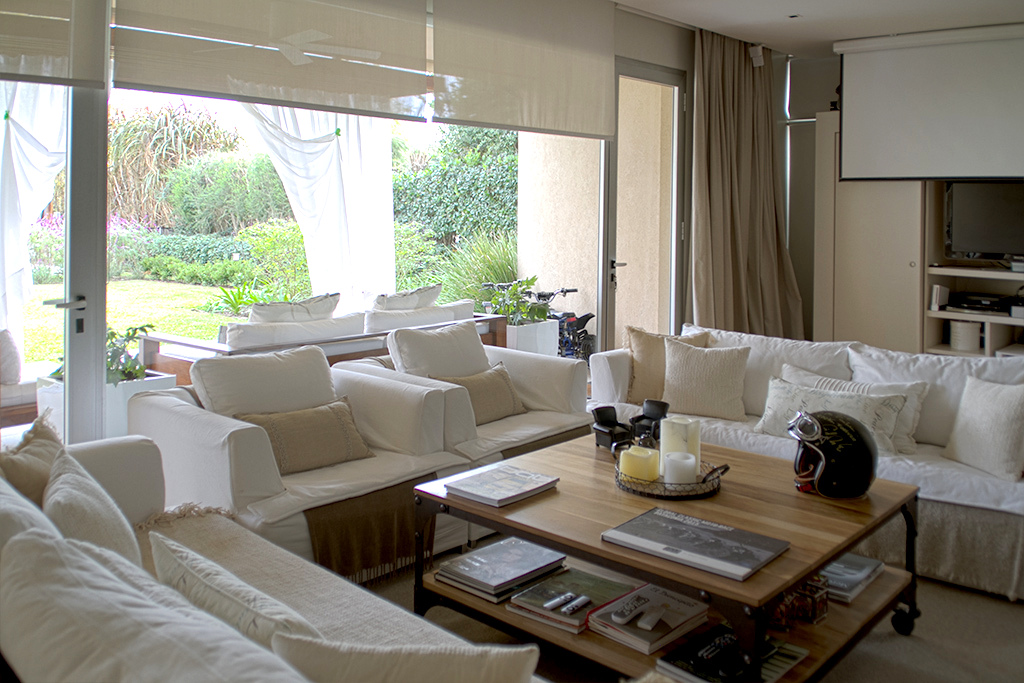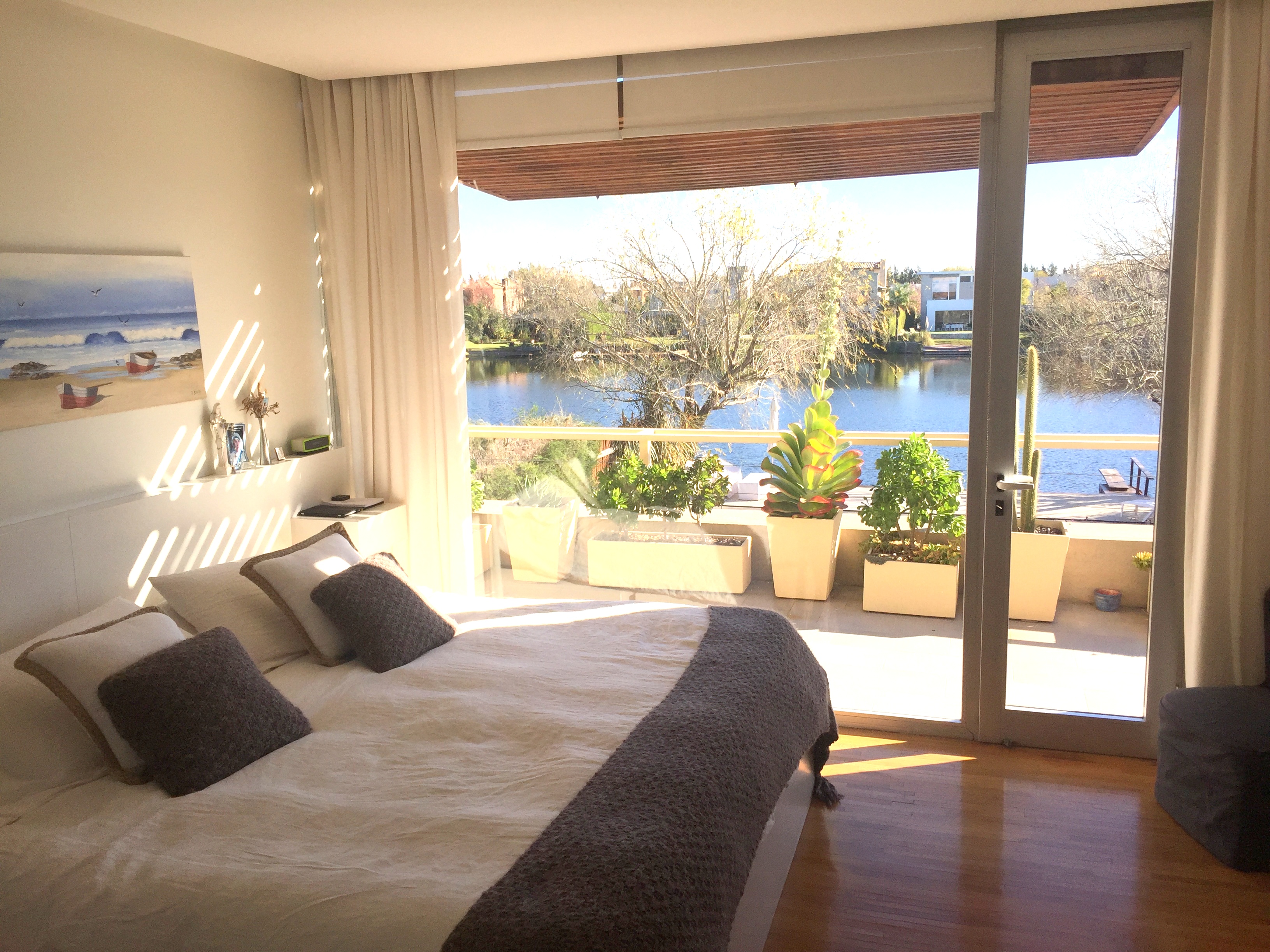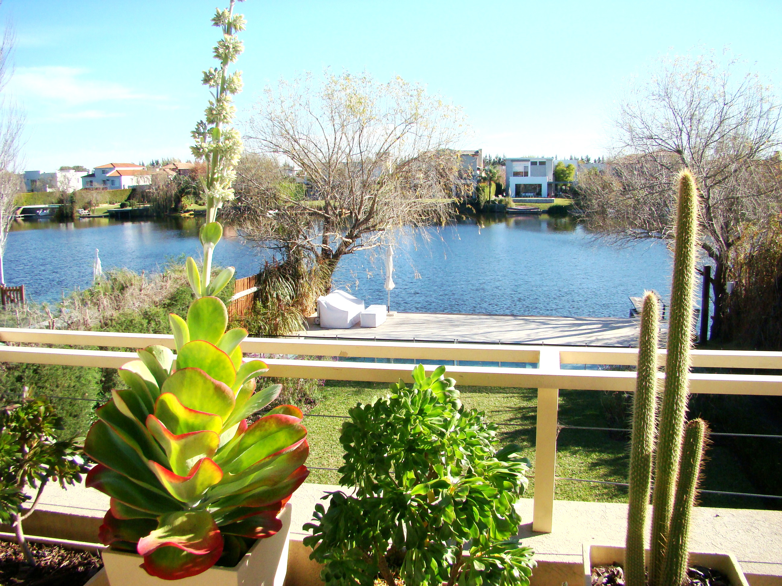 Planta Baja: Amplio hall de recepción, living-comedor apaisado con una muy linda vista al jardín y a la laguna, toilette de recepción, cocina semi integrada con una barra con el comedor diario totalmente equipada, y mucho lugar de guardado en bajo mesada y alacenas, bacha doble y espacio para heladera grande, dependencia de servicio y lavadero independiente.