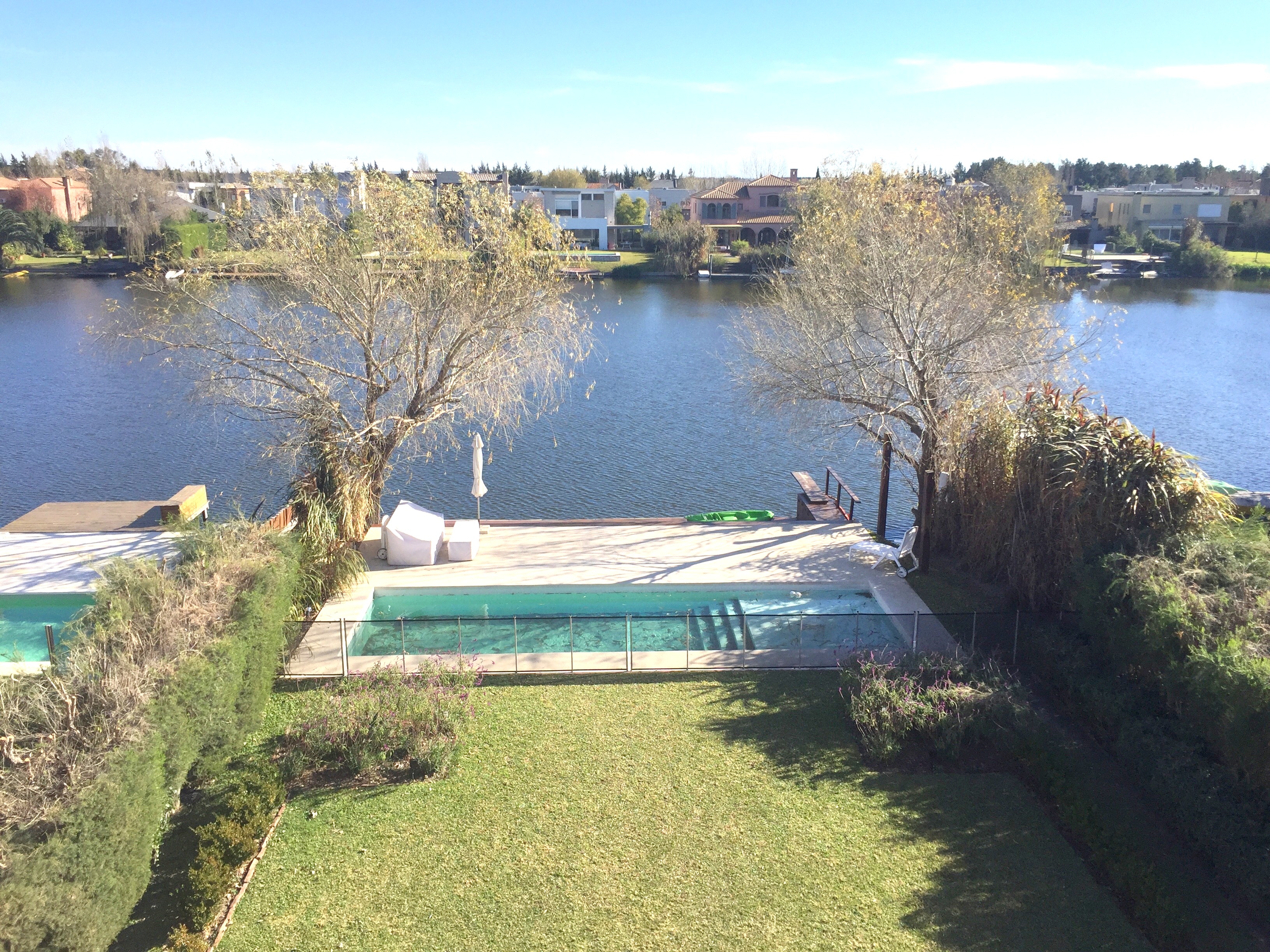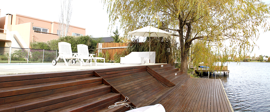 Piscina con solárium y desborde al infinito, luces y calefacción, y un muy amplio muelle con deck de lapacho, que abarca todo el ancho del terreno.